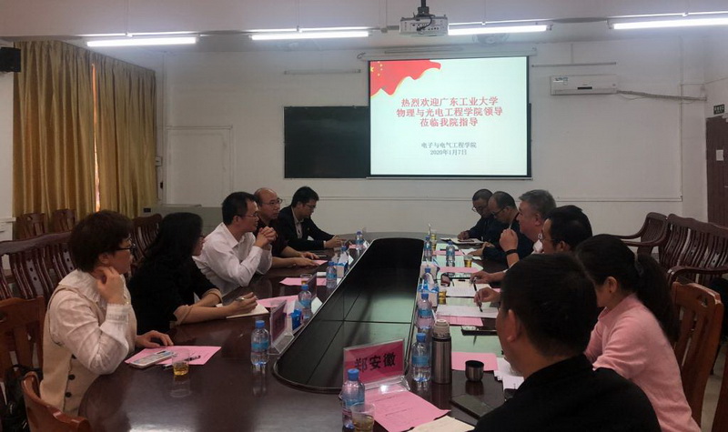 1月7日下午,广东工业大学物理与光电工程学院党委书记蓝锐彬、执行院长赵韦人等一行11人来访我院,开展互访交流和支部共建活动。学校教务处副处长张伟、电子学院党委书记黄伟出席,宾主双方20多人参加交流座谈活动。