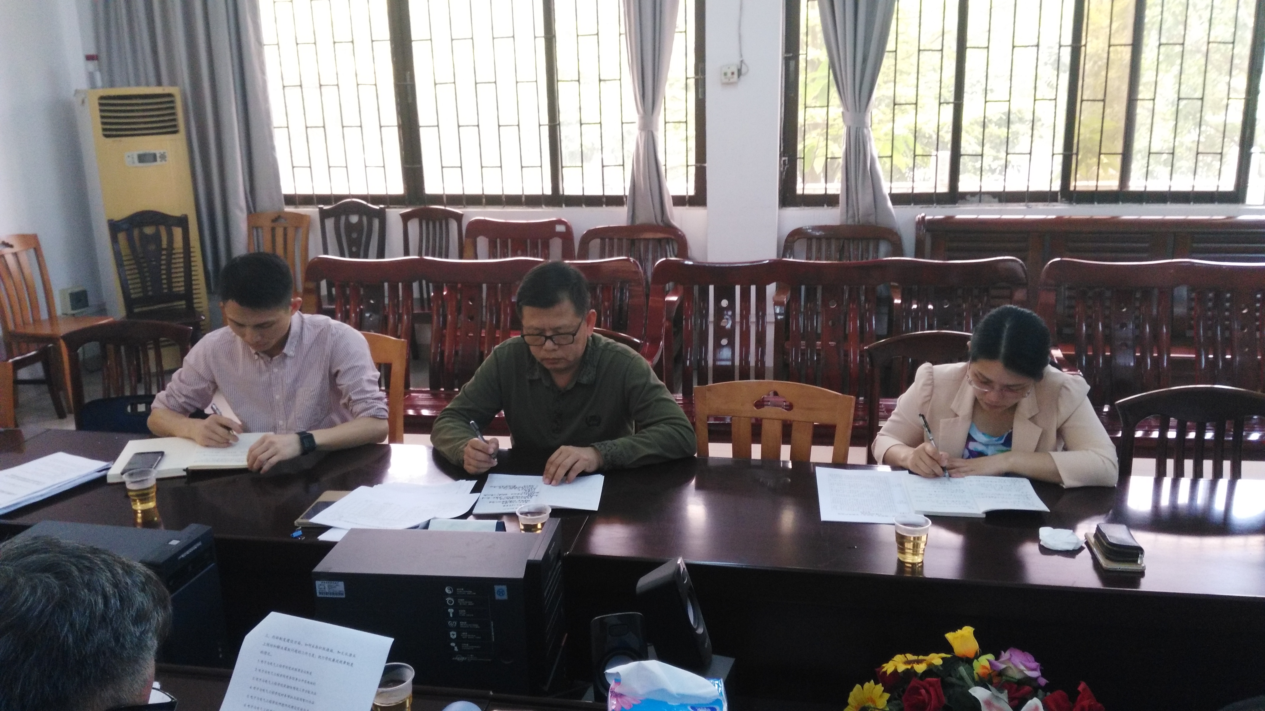 陈处长首先就本次党风廉政建设责任制工作考核检查进行说明,主要包括两个步骤:一是听取党委书记的汇报,二是检查相关材料。接着,我院黄书记就从严抓好思想政治建设、从严规范党内政治生活、从严深化作风建设、从严强化党内监督、从严推进反腐倡廉建设、从严落实管党治党责任等六个方面进行汇报,并总结出我院党委党风廉政建设责任制工作的两大特色:一是健全组织机构和完善各项规章制度,使得工作的开展有章可循、有据可依;二是配合学校的工作顺势而为,切实做好党风廉政建设责任制的各项工作。同时也指出了我们工作的不足之处:一是原始材料的收集保存方面有待改进;二是党员责任岗、党员先锋岗活动还有待加强。