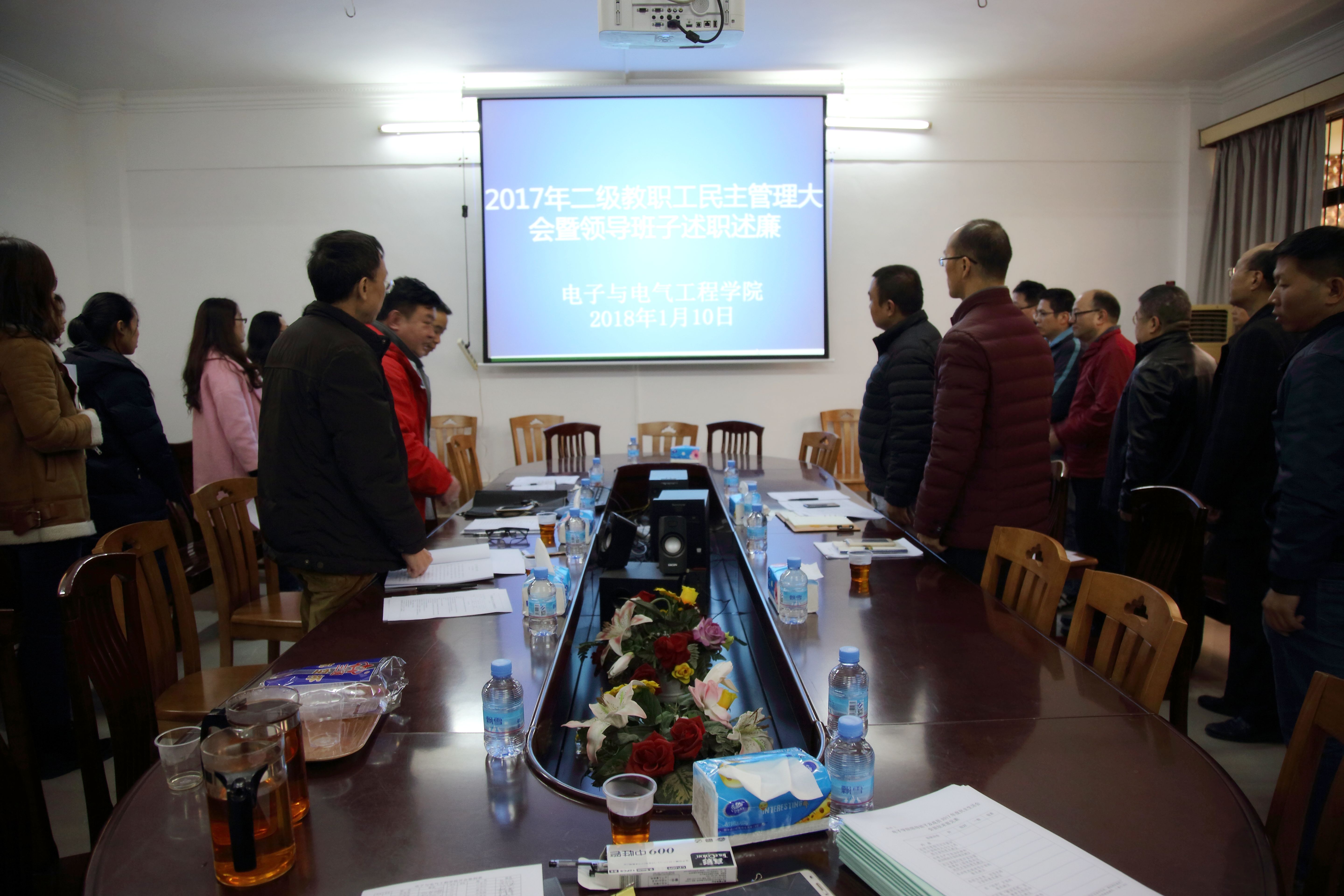 2018年 1月 10日下午,我院在会议室召开了电子与电气工程学院2017年教职工民主管理暨述职述廉大会,学院党政领导以及全院教职工参加了本次大会,学校委派代表白英副处长前来指导工作。