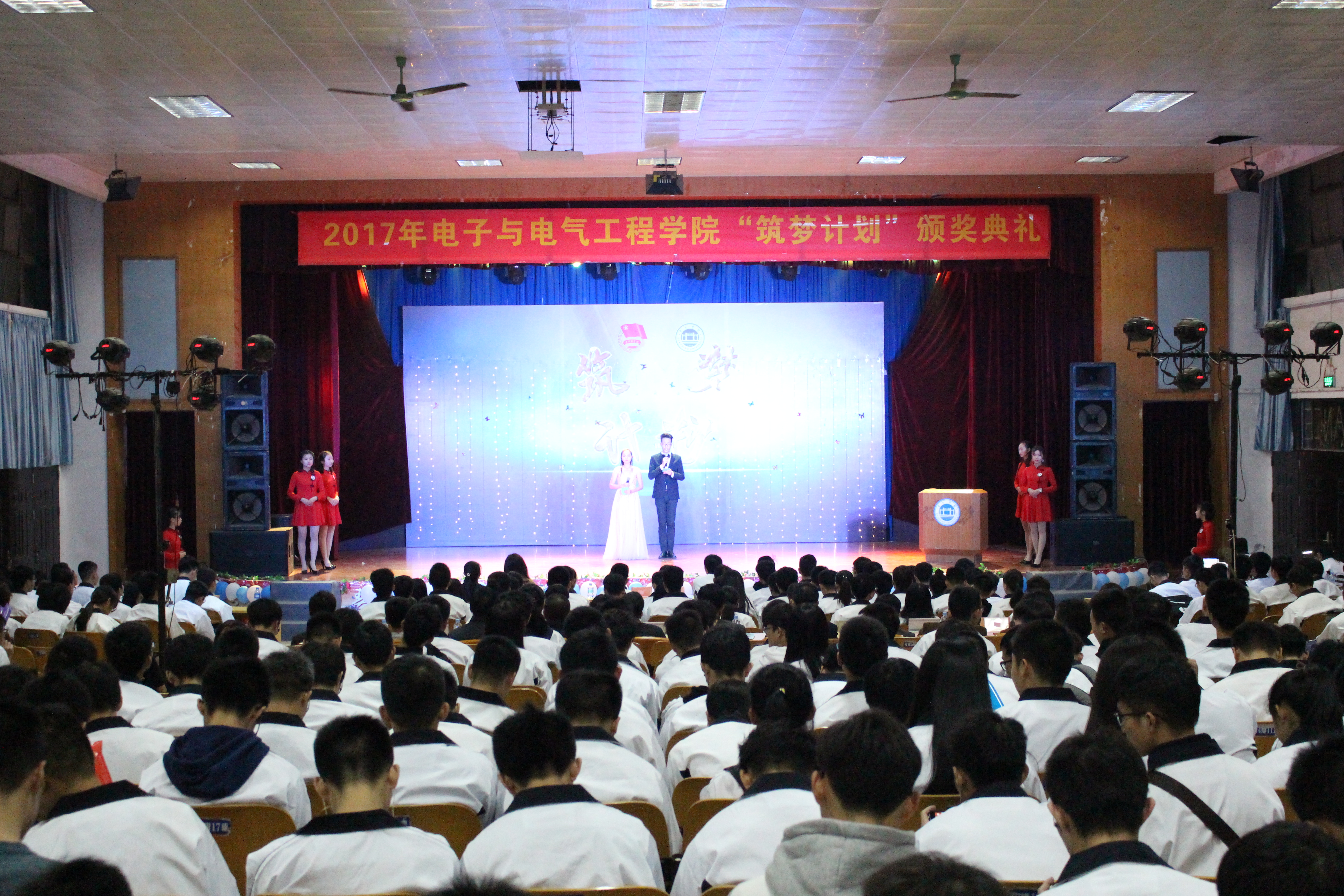 本网讯(记者 郑佳辉 伍志杰 指导教师 邓家鑫) 为激发我院学生勤奋学习、积极进取的精神,促进我院学生综合素质有效提升,2017年12月27日晚,我院在学生活动中心大礼堂举办了2017年电子与电气工程学院“筑梦计划”颁奖典礼。我院党委书记黄伟、院长陈英俊、校学生工作处副处长罗永全、校就业指导处副处长谭铁伟、学院党委副书记薛日金、学院副院长李云鹤以及学院辅导员和部分老师、学生出席参加了本次典礼。