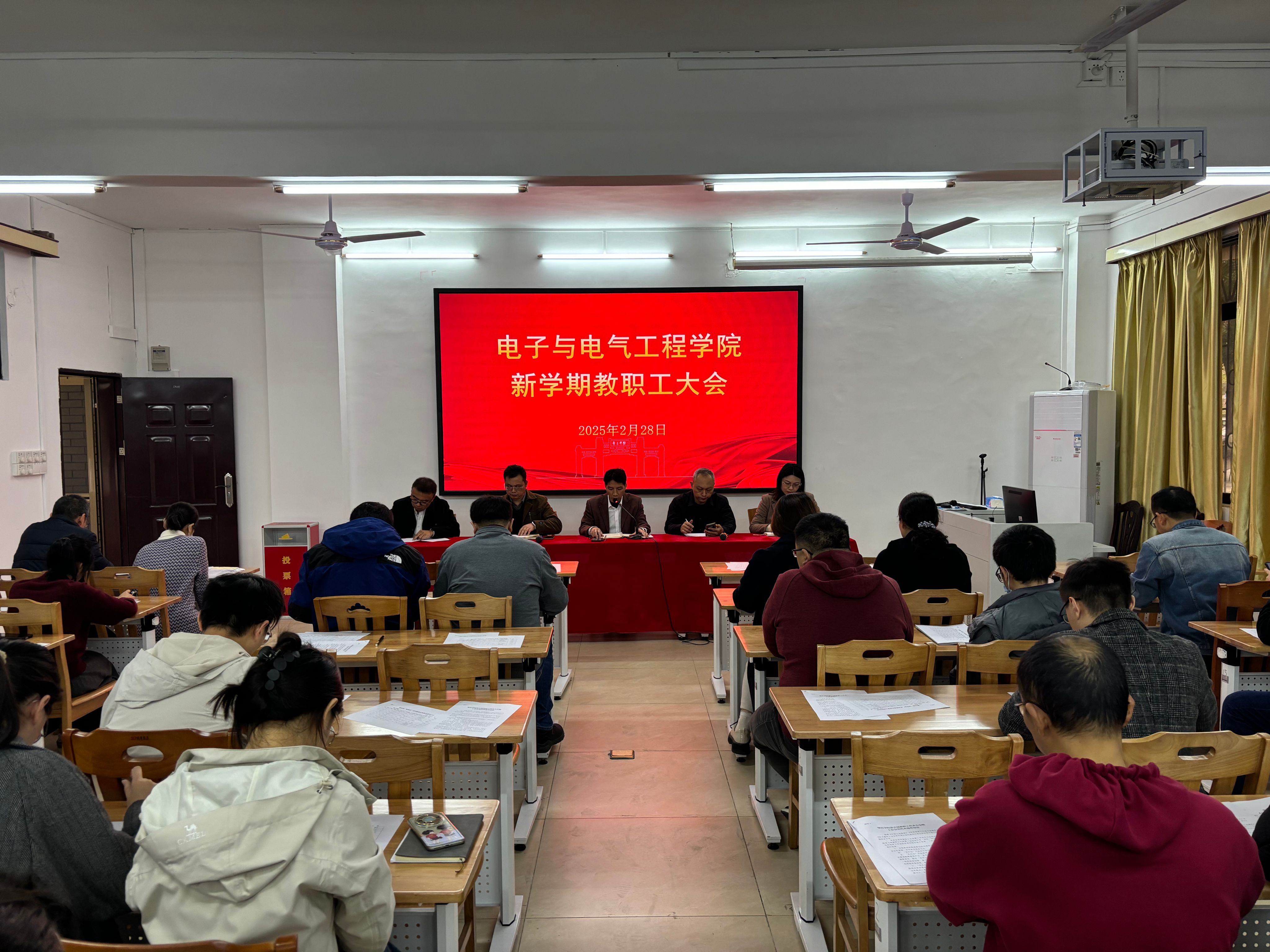 【本网讯】2月28日,电子与电气工程学院召开新学期工作会议,会议传达贯彻全国全省教育工作会议、全省全市和学校高质量发展大会精神,全面谋划了新学期工作,确保2025年春季学期安全、平稳、有序进行。