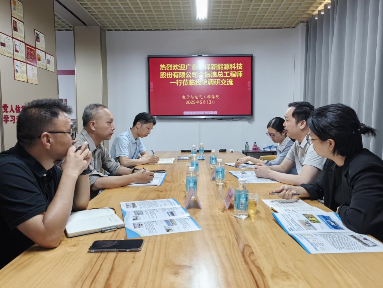 2025 年 5 月 13 日,广东华锋新能源科技股份有限公司铝箔事业部全振浪总工程师一行莅临电子与电气工程学院,就有关合作项目开展调研交流。学院党委书记王浩发、院长陈庆华、副院长李云鹤等热情接待并参与交流。