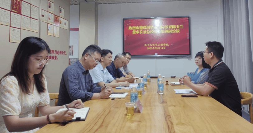 2025年5月14日,深圳市华希国际教育科技有限公司陈玉兰董事长兼校长、梁聚航副校长等一行到访太阳成集团tyc122cc入口,与学院党委书记王浩发、院长陈庆华等就课程合作培训项目进行洽谈。
