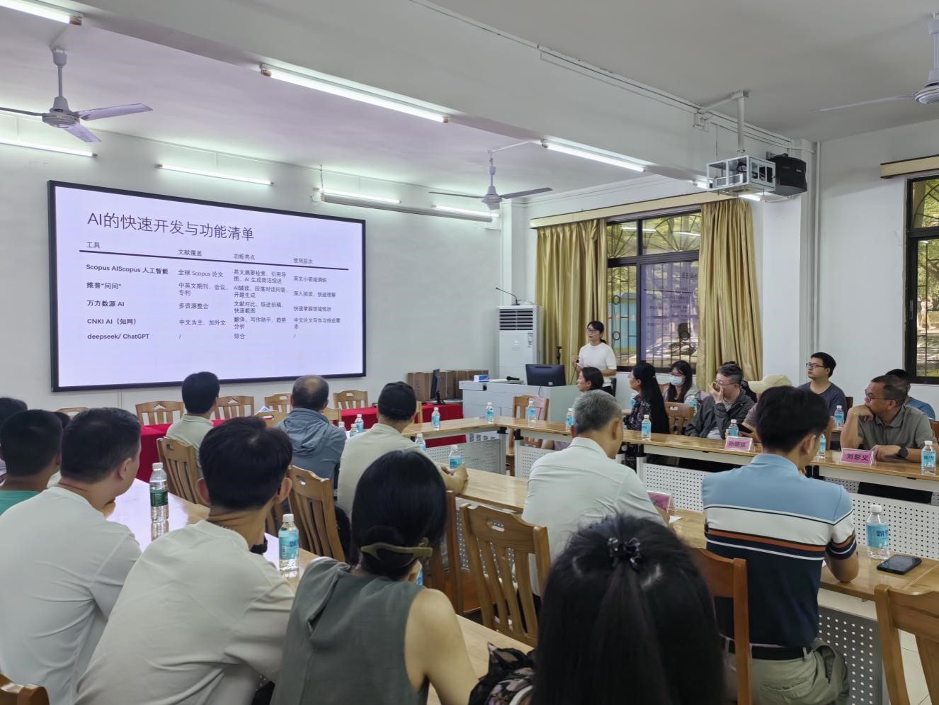 随后,电子与电气工程学院彭洁副教授就人工智能时代,AI 如何赋能科研工作作了专题报告。她结合自身科研实践,深入浅出地阐述了 AI 技术在科研选题、数据分析、模型构建等环节中的应用优势与创新模式,为在场人员带来了前沿的科研理念与方法,也为两院在科研领域的合作交流提供了新的思路与方向。