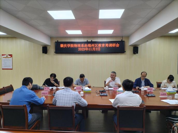 【本网讯】2023年11月2日上午,在我院党委书记黄伟带领下,副院长程绪信、副院长刘立程和物理系部分教师组成调研组,前往肇庆市端州区教育局开展座谈交流和调研工作。端州区教育局杨坚副局长、人事股股长温浩宇、范嘉慧主任、物理教研员周新书等领导热情欢迎和接待了调研组。