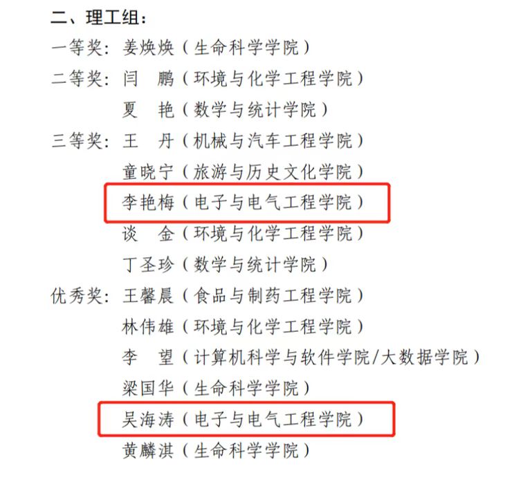 在肇庆学院组织开展的2022年度教师教学大赛活动中,我院教师积极申报、充分准备,经专家组评审及全校公示,我院李艳梅老师荣获2022年度肇庆学院教师教学大赛理工组三等奖,吴海涛老师荣获2022年度肇庆学院教师教学大赛理工组优秀奖,为推动我院教师在教学岗位上积极进取、主动成长发挥了优秀的示范作用。