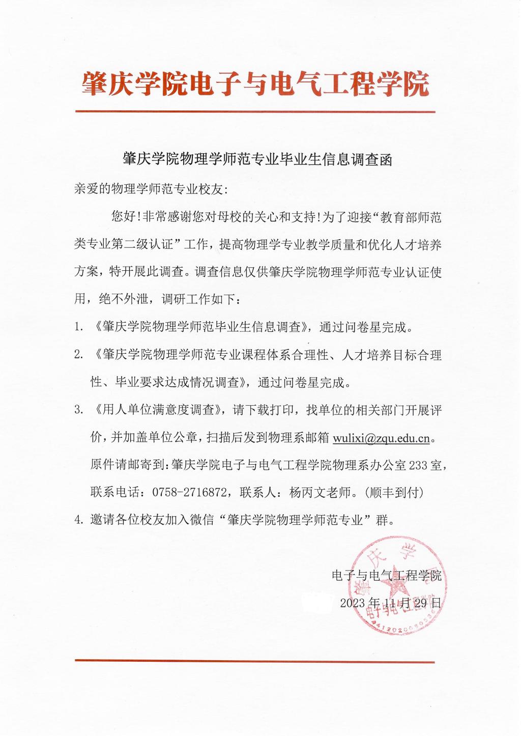 1. 肇庆学院物理学师范毕业生信息调查表,通过问卷星完成https://www.wjx.cn/vm/PSh5eia.aspx#。问卷中工作后所获得的个人荣誉(个人荣誉、获奖证书、职称证书等材料的电子版,发至邮箱wulixi@zqu.edu.cn)