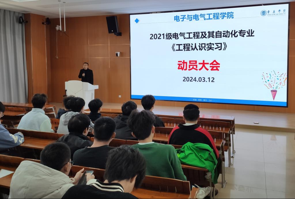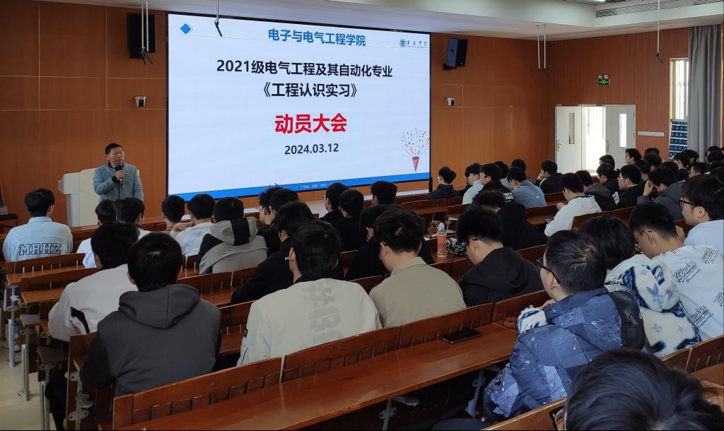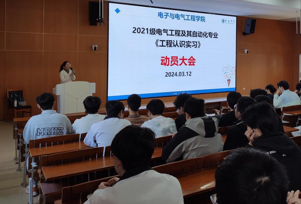 【本网讯】3月12日,我院在第二教学楼704教室召开2021级电气工程及其自动化专业学生《工程认识实习》动员大会。学院副院长李云鹤、实习指导教师黄丽平、辅导员郑安徽、邱景鸿以及2021级电气专业班全体学生参加了会议,会议由黄丽平主持。