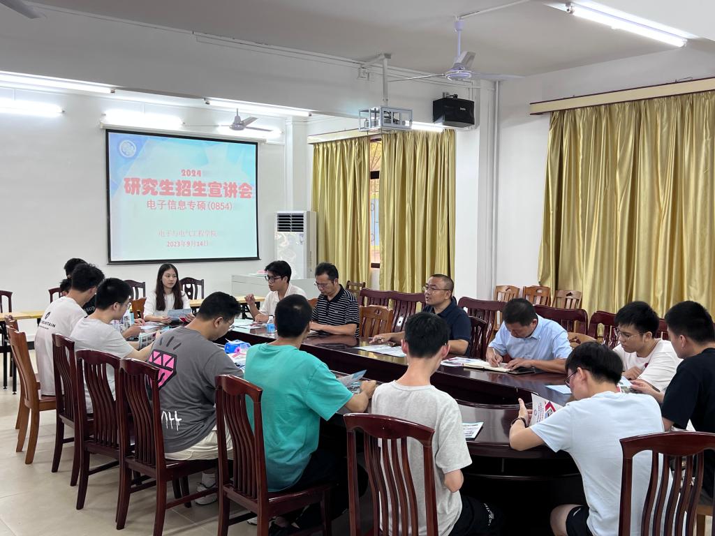 【本网讯】为进一步做好我校2024年电子信息专业硕士研究生招生宣传工作,鼓励更多优秀学生报考,我院于9月14日在实验大楼128会议室举办2024年硕士研究生校内宣讲会。学院副院长李云鹤、党委副书记傅汉球,及2024届30多名工科考研毕业生等参加宣讲会。