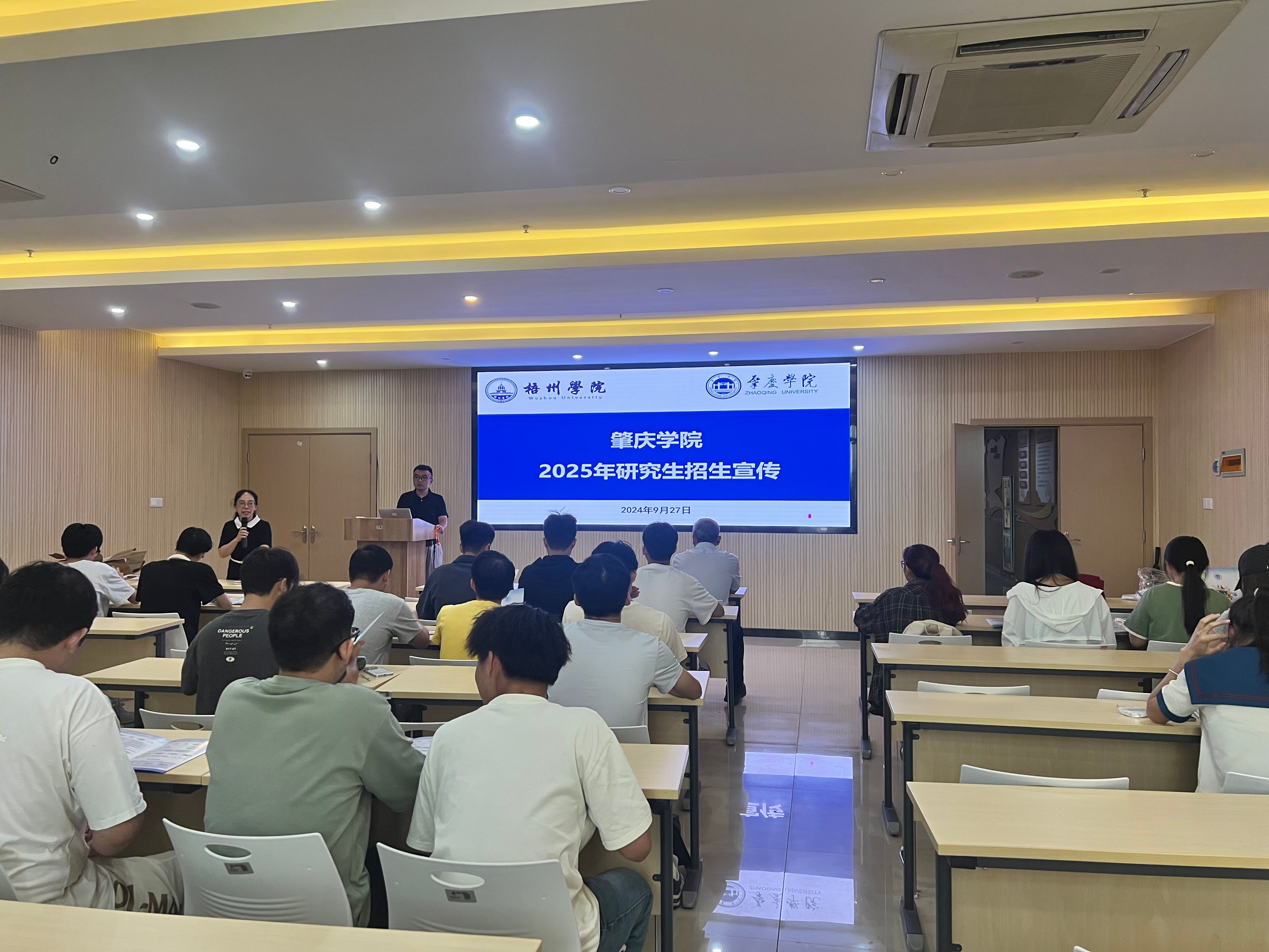 在梧州学院宣讲会上,共吸引了近百名来自该校多个二级学院、专业的考研学生,涵盖了电子与信息工程学院、机械与资源工程学院、大数据与软件工程学院、教师教育学院、文学与传媒学院、马克思主义学院等相关专业学生。陈庆华院长详细介绍了肇庆学院的办学特色、师资力量、科研成果以及研究生教育的优势和特点,并向梧州学院的学子们发出了诚挚的邀请。李云鹤副院长从学校概况、招生领域、研究方向及成果、硕导情况、研招政策等方面进行了全面的介绍。在互动答疑环节,陈庆华、李云鹤耐心解答了同学们关于研究生招生、培养、就业等方面的问题,并鼓励他们坚定信心,积极备考。现场气氛热烈,同学们纷纷表示受益匪浅。