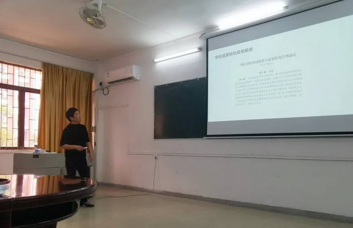 科技处副处长周丽传达了《肇庆学院科技成果转移转化政策》主要精神,并介绍了我校各二级学院近年来专利获批情况。电子学院专利数占比达40%以上。
