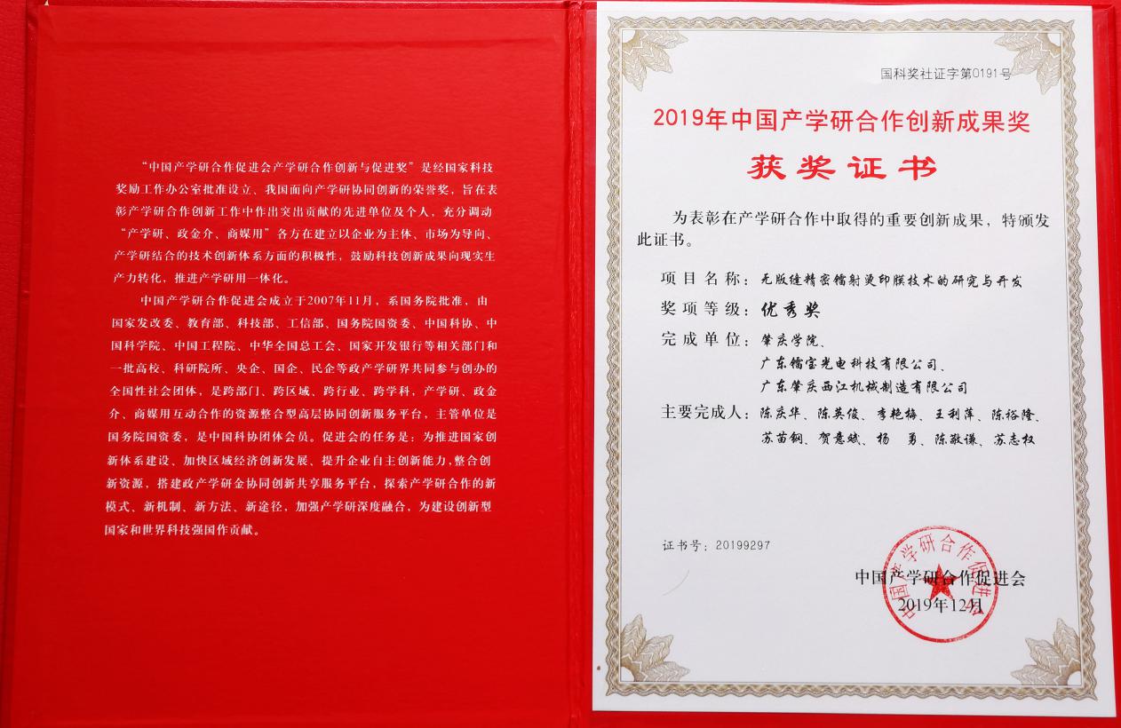 近日,中国产学研合作促进会公示了2019年中国产学研合作创新与促进奖获奖项目,我院陈庆华、陈英俊、李艳梅、王利萍、陈裕隆申报的项目“无版缝精密镭射烫印膜技术的研究与开发”获2019年中国产学研合作创新成果奖三等奖(肇庆学院为申报单位,广东镭宝光电科技有限公司、广东省肇庆西江机械制造有限公司为合作完成单位),实现了学校在国家级产学研合作创新与促进奖上的零的突破。