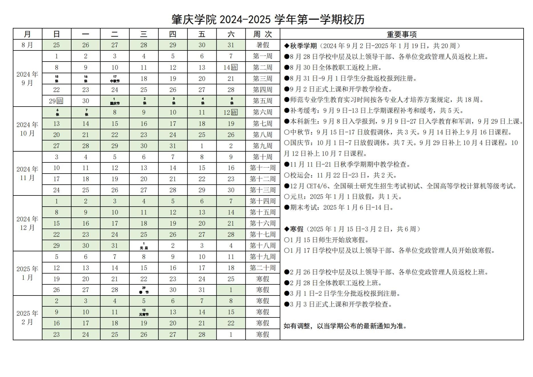 2024-2025学年第一学期校历(2024.9-12)