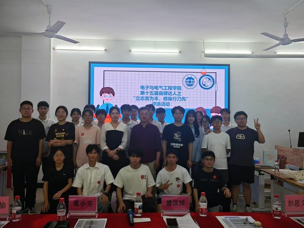 【本网讯】2025年4月18日晚,电子学院举办“自律达人”比赛决赛在实验大楼128举行。初赛选出2024级6位选手参加决赛,学院律委会、班纪律委员等20多人参加活动。学院党委副书记傅汉球、辅导员老师吴小芬出席活动并作评委。