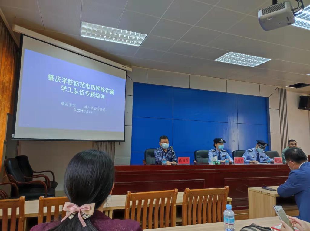2022年3月15日,肇庆市端州区公安分局来到学校,为学工队伍开展防诈骗宣传教育培训会,进一步做好防范电信网络诈骗宣传教育工作。