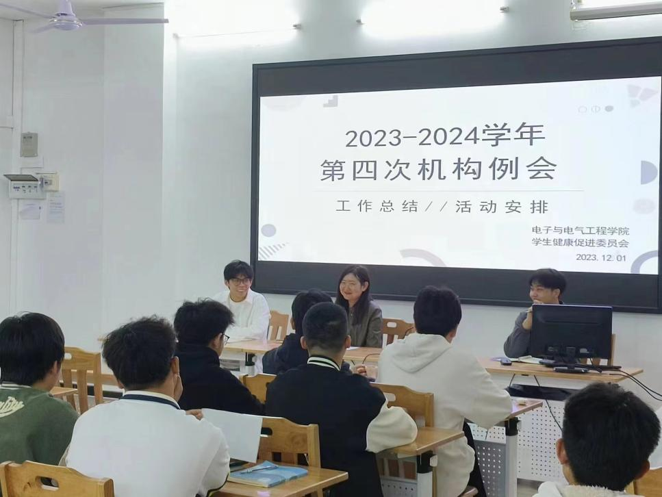 我院学生健康促进委员会于2023年12月1日在实验大楼128召开了机构例会。会议由刘雨阳老师主持,机构全体成员参加此次会议。此次例会主要内容主要有以下三个方面:首先,老师对前期工作心理普测及秋季心理排查的顺利进行了表扬,对全体成员的辛勤付出表示肯定。面临期末考试,同学需要调整好状态,密切留意学院同学心理状况,迎接期末考试;第二,健促拟定12月12号开展活动——“不做脆脆鲨,要做大鲨鱼”,各成员、合理安排时间,各部门通力配合;第三,指导老师刘雨阳为正式成员颁发聘书,希望同学们继续努力。此次例会的召开,为机构工作指明了方向,凝聚了力量。健康促进委员会机构成员表示,将继续努力,为学院心理工作的开展贡献力量!