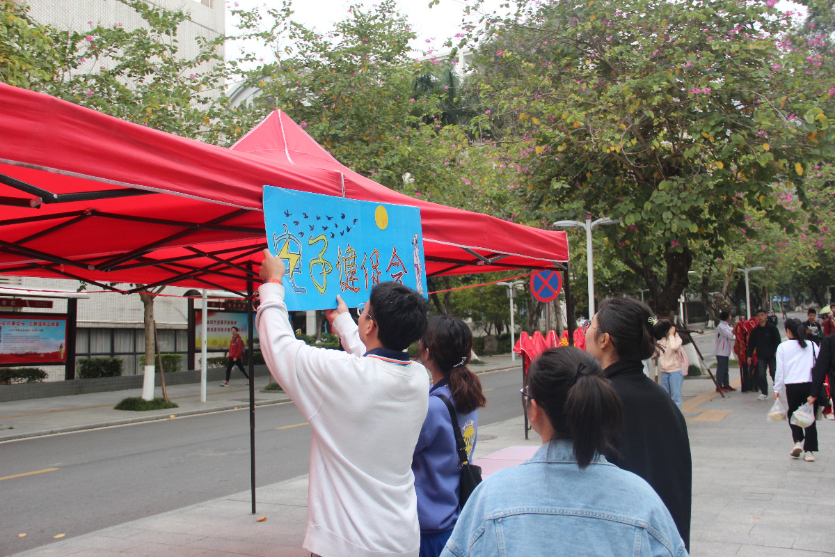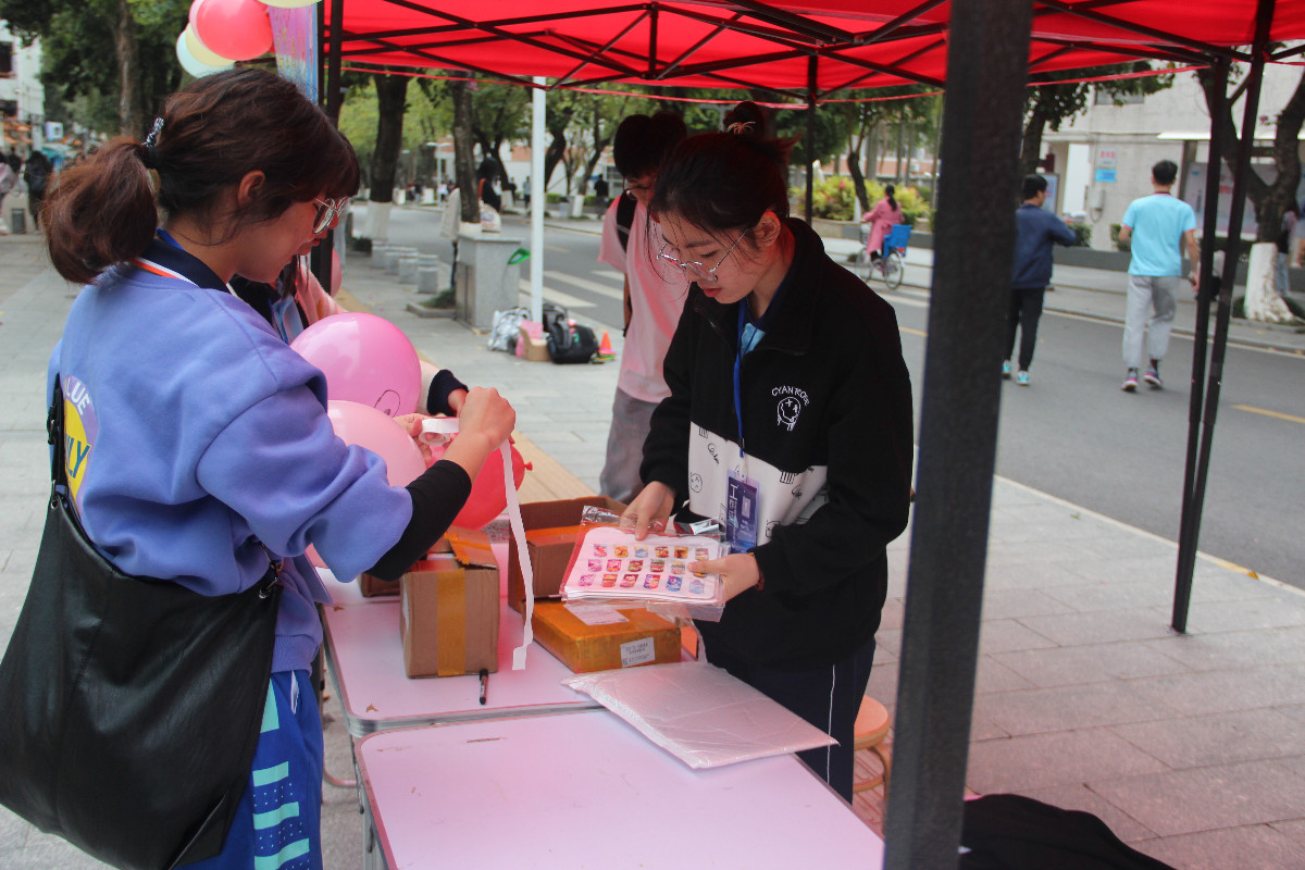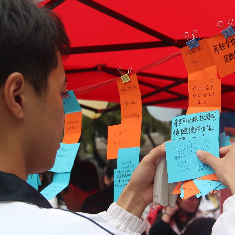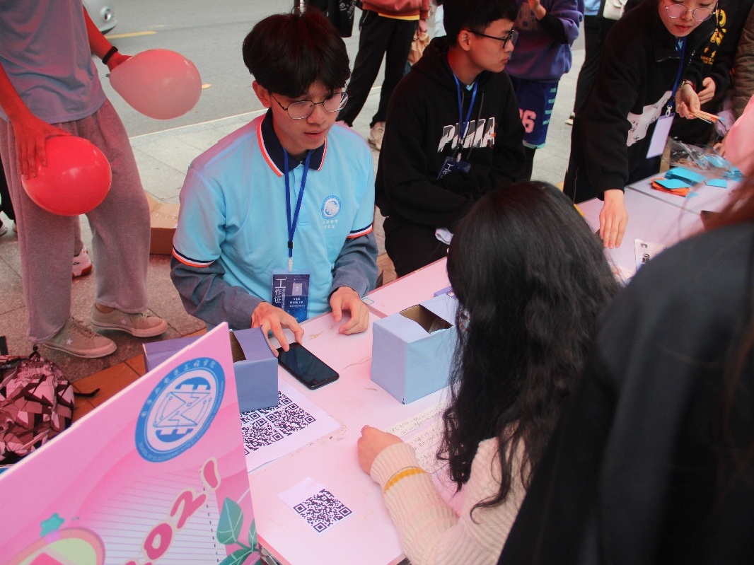 同学们在盲盒中抽取印有健康标语的纸条,经过30秒的简单记忆在工作人员面前进行简单背诵,女生们在获取奖励的同时,收获健康知识。