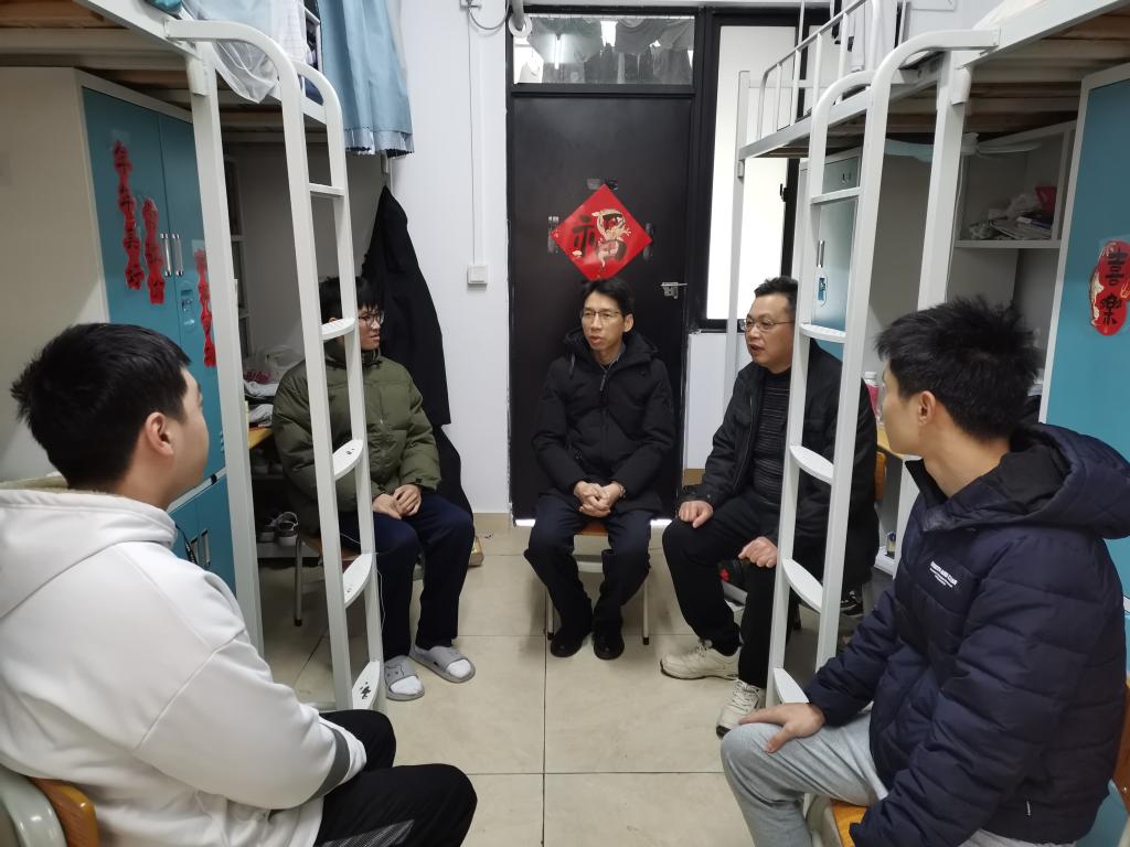 1月25日上午,王浩发、傅汉球带队走访看望寒假留宿学校的部分学生。在榕华苑学生宿舍,王浩发与留宿同学们进行亲切交流,深入了解寒假期间留宿同学的学习、生活情况,提醒同学们注意穿衣保暧,并在老师的指导下认真做好竞赛备赛工作,争取优异的成绩。在紫荆书苑女生宿舍,王浩发叮嘱假期留宿同学要注意防寒保暖,及时向家人、老师报平安,增强安全防范意识,注意用电安全、返家交通安全等。
