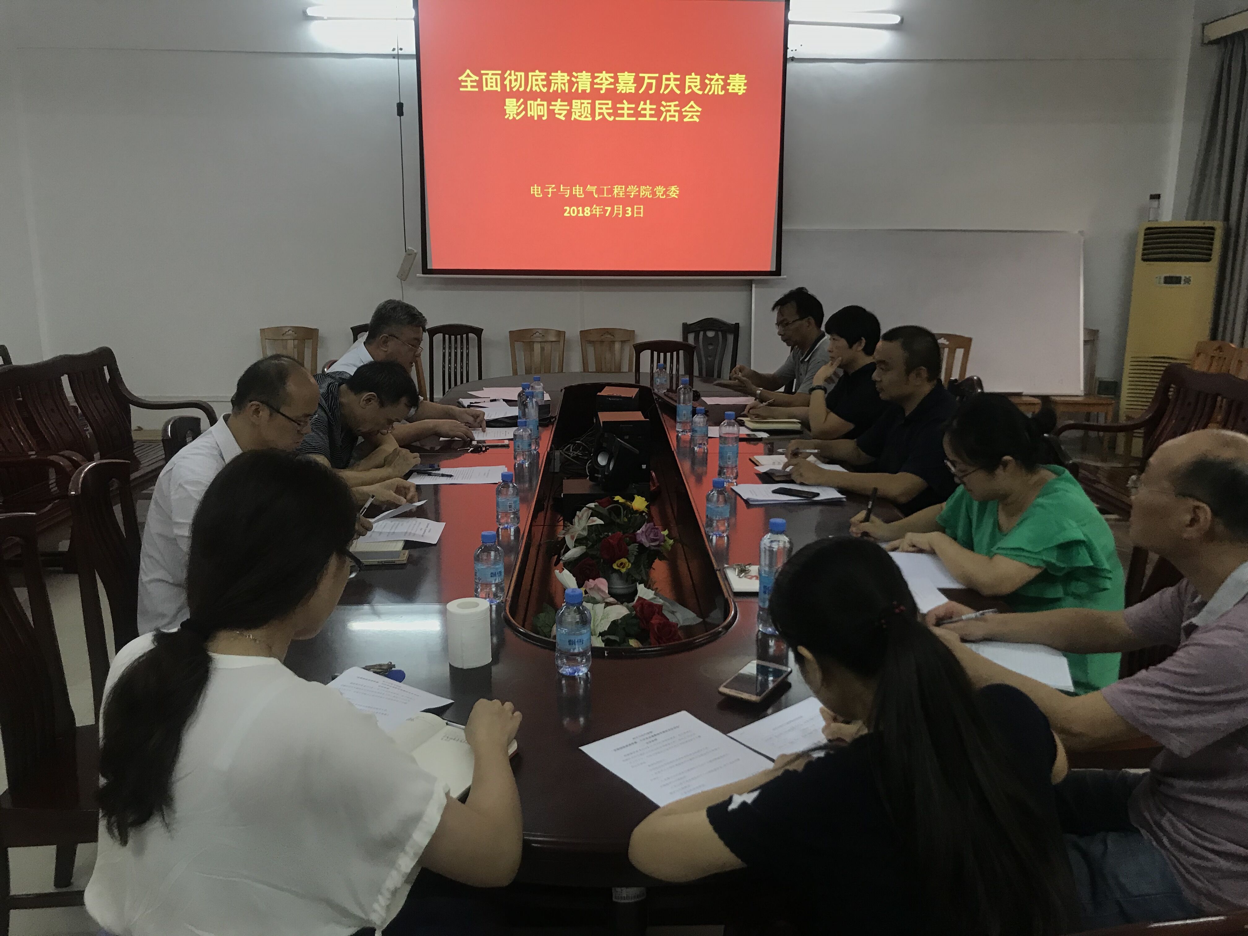 2018年7月3日下午,我院在会议室召开了主题为全面彻底肃清李嘉万庆良流毒影响专题民主生活会,教务处副处长李妍作为校级代表莅临指导,我院党政班子成员、党委委员、教工党支部书记、办公室主任、专职组织员等参加了本次专题民主生活会,民主生活会由黄伟书记主持。