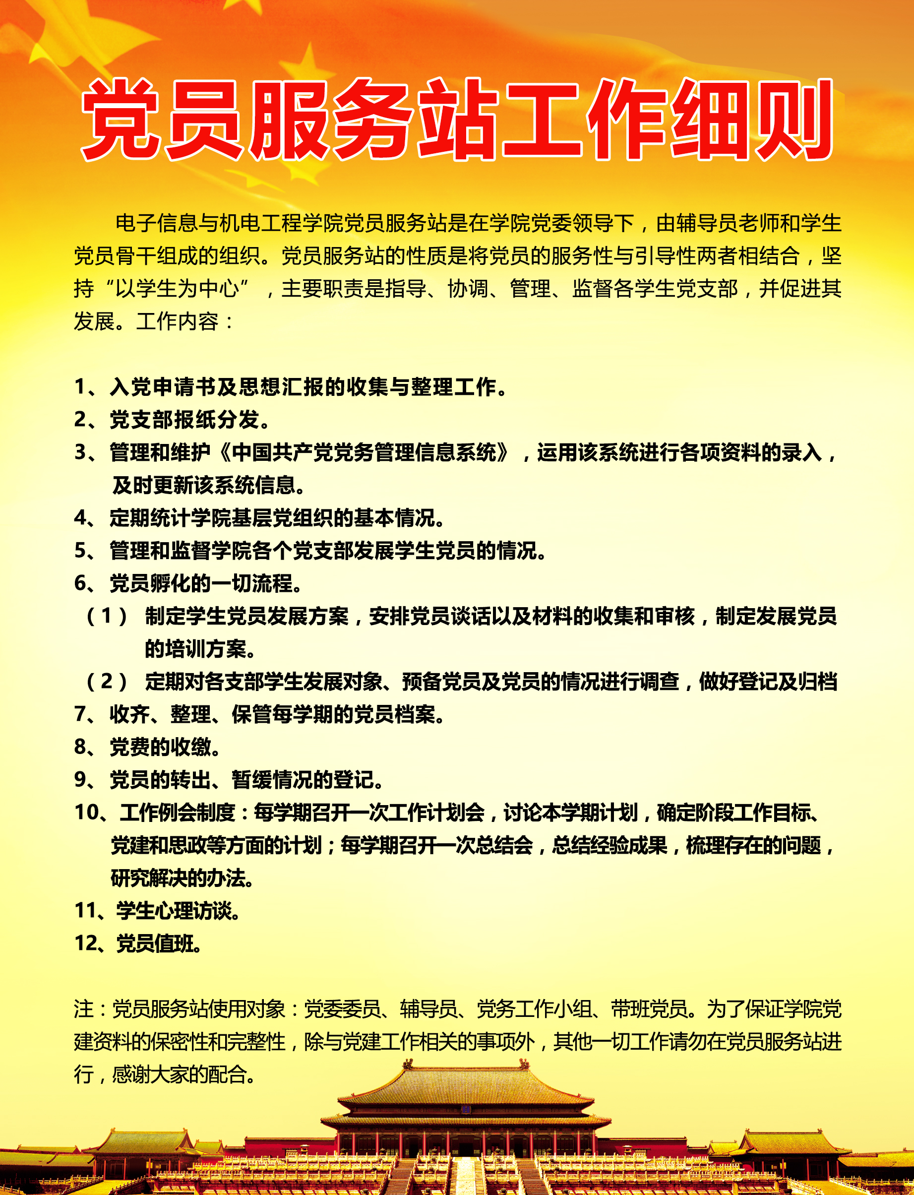 电子信息与机电工程学院党员服务站是在学院党委领导下,由辅导员老师和学生党员骨干组成的组织。党员服务站的性质是将党员的服务性与引导性两者相结合,坚持“以学生为中心”,主要职责是指导、协调、管理、监督各学生党支部,并促进其发展。工作内容: