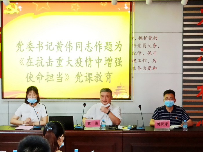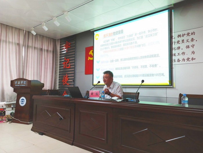 2020年5月29日下午,我院党委组织第3批返校毕业生党员在初心堂,开展“思政第一课”暨党员党课及毕业教育,由党委书记黄伟主讲,题目是《在抗击重大疫情中增强使命担当》。学院党委副书记傅汉球,学生党支部书记和毕业生党员参加,专职组织员刘浏主持会议。主要内容有:重温入党誓词、毕业生返校及毕业工作说明、思政第一课《在抗击重大疫情中增强使命担当》、学院党委致毕业生党员一封信、老师毕业寄语和毕业生党员组织关系办理说明等环节。