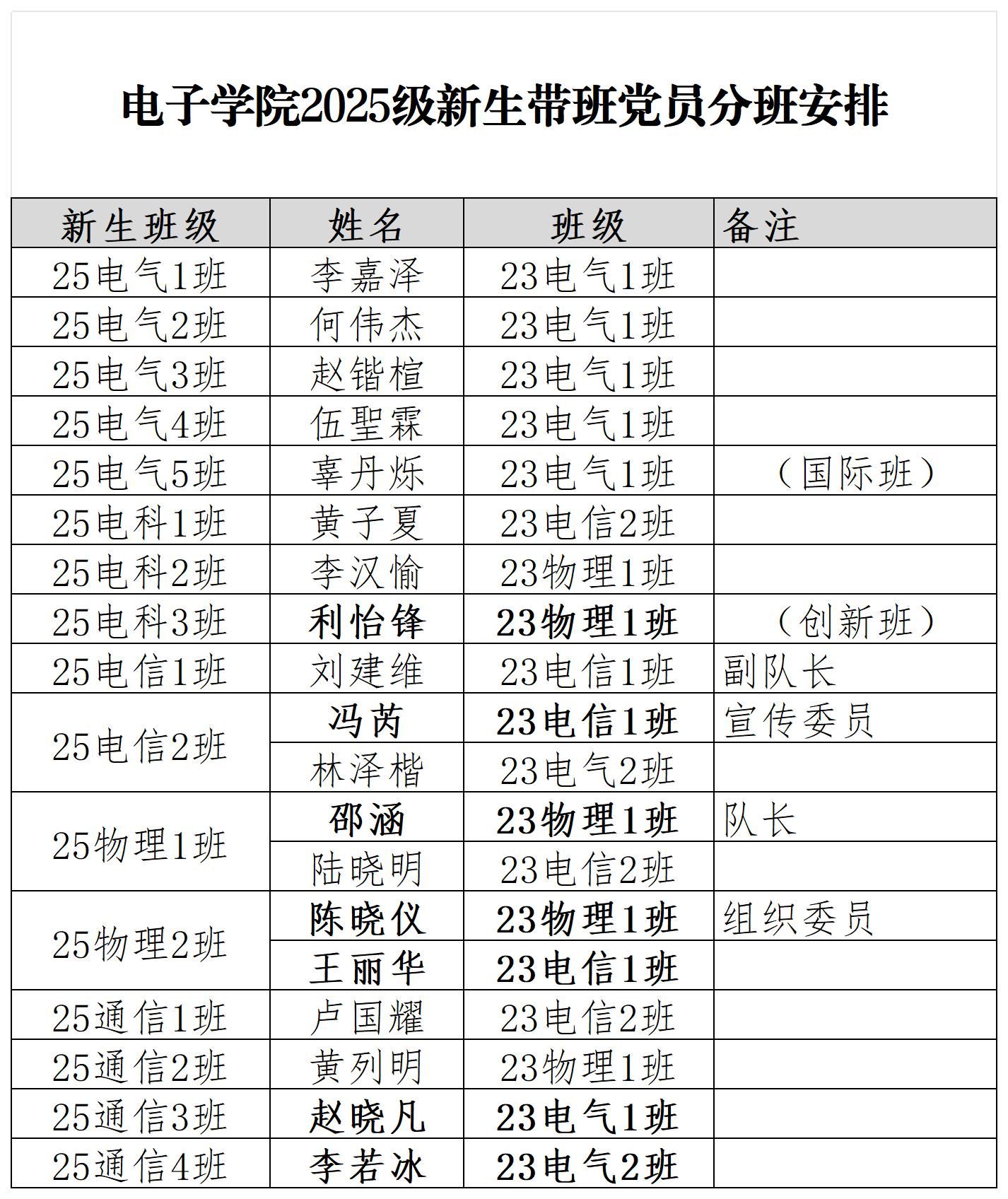 电子学院2025级新生带班党员分班安排