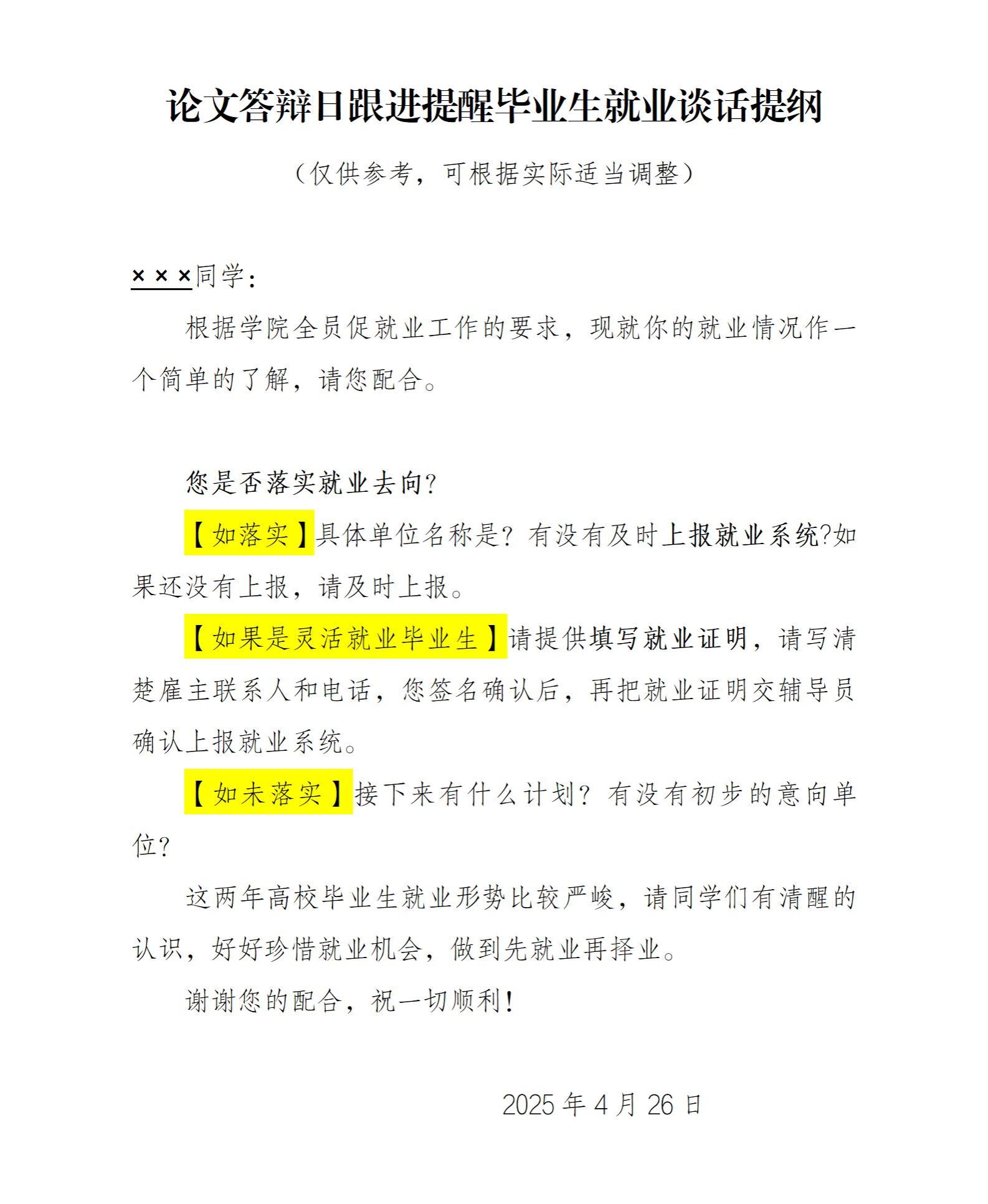 我院2025届共有623名毕业生,这是我院办学历史上毕业人数最多的一年,而且受整体经济环境影响,今年的就业压力相当严峻。为做好2025年毕业就业工作,需发动学院全体教工促进毕业生就业,根据学院全员促就业统一安排,现请各位论文导师协助收集本组毕业生就业信息,并协助督促指导毕业生就业去向落实。具体做法:
