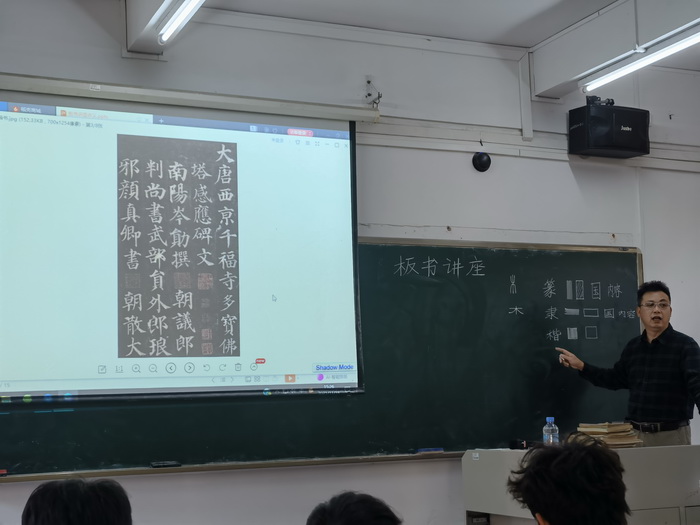 我校师范生有每天早晨练习粉笔字的习惯,21级的物理系学生入学不久,近期开始粉笔字书写练习,很多学生不知道如何写好粉笔字。傅老师的讲座内容侧重于实际粉笔字书写,首先给同学们展示了优秀的黑板粉笔字作品和教学板书范例,并且现场演示了如何在小黑板上快速并且美观地完成书写,如何控制好板书的行距、字距、字体大小等要素。此外,讲座内容还对中国书法的发展过程进行了简要的介绍,从最早的甲骨文到后续的青铜文,再到小篆、隶书、楷书、行书、草书等字体,对历史上著名书法家的作品进行了展示和讲解,增加了学生对我国传统书法文化的认识,提升了学生对书法艺术的欣赏能力。学生通过讲座不仅学到了粉笔字书写的实际技能,而且提高了学生的热爱传统文化和爱国的情怀。