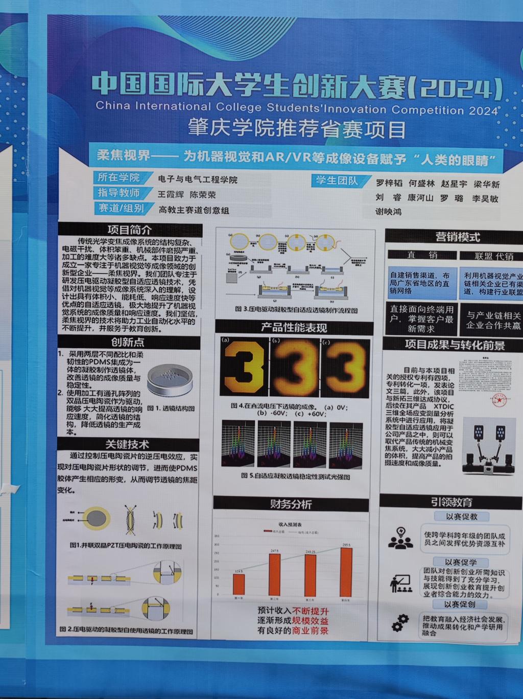 【本网讯】6月19日,我校召开中国国际大学生创新大赛(2024)肇庆学院初赛总结大会暨省赛出征动员会。电子与电气工程学院参赛项目--“柔焦视界”项目,在校级选拔赛中脱颖而出,荣获金奖之一,并将代表学校参加即将举行的省级创新大赛。本项目由罗梓韬负责,何盛林、赵星宇、梁华新、刘睿、康河山、罗璐、李昊敏、谢映鸿等同学参与,由学院老师王霞辉、陈荣荣、王利萍和陈庆华等老师共同指导。王霞辉老师获优秀指导老师奖。