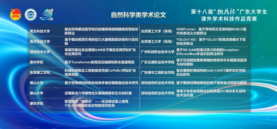 【本网讯】近日,由团省委、省教育厅、省科学技术厅、省科学技术协会、省社会科学院、肇庆市人民政府共同主办的第十八届“挑战杯”广东省大学生课外学术科技作品竞赛在我校顺利举办。在这场汇聚全省高校智慧与创意的赛事中,161所高校同台竞技,展现出强劲的学术实力与创新活力,在多个赛道中崭露头角,为学校在学术科技领域再添佳绩。