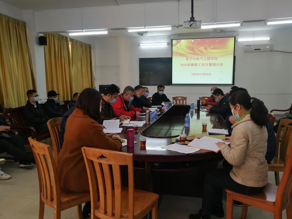 2020年12月30日下午2:30时,电子与电气工程学院在学院实验大楼208会议室召开2020年教职工民主管理大会暨学院领导干部述职述廉汇报会。学院党政领导班子和全体教职工参加了本次大会,校科技处徐士河副处长出席大会并指导考核工作。会议由学院党委书记黄伟主持。