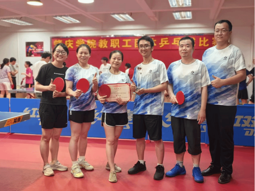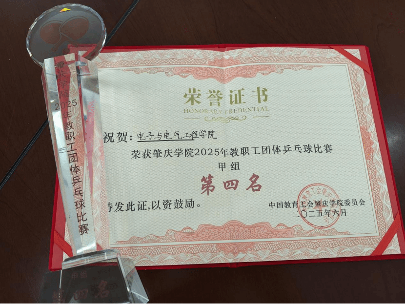 近日,肇庆学院 2025 年教职工团体乒乓球比赛圆满落下帷幕,电子与电气工程学院教职工代表队凭借顽强的拼搏精神,精湛的球技和默契的团队配合,在比赛中荣获甲组第四名的优异成绩,为学院争得了荣誉。