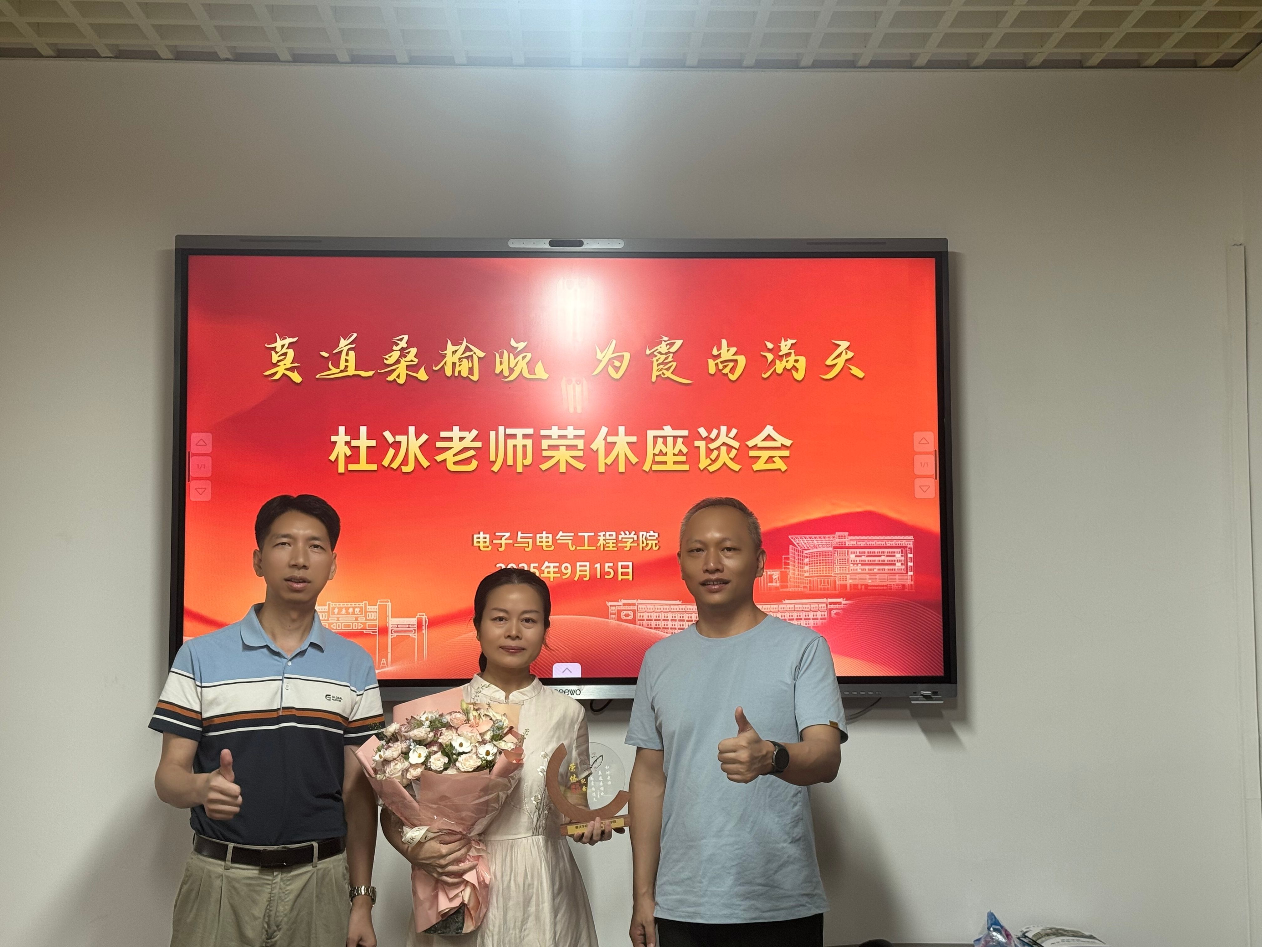 【本网讯】2025年9月15日,电子与电气工程学院为杜冰老师举办了一场温馨而庄重的荣休仪式,学院领导、工会委员和教师代表等齐聚一堂,共同见证这一难忘时刻。
