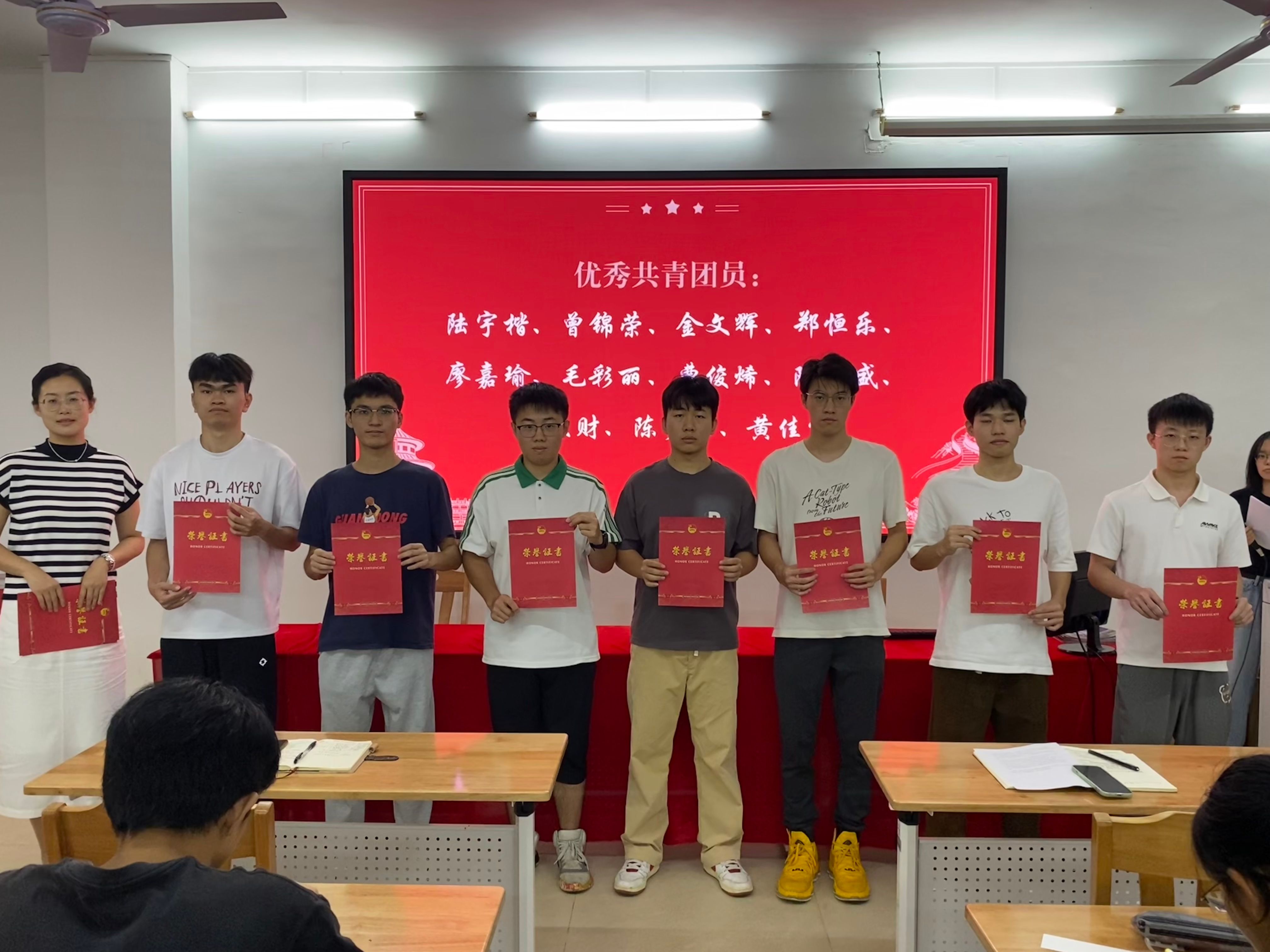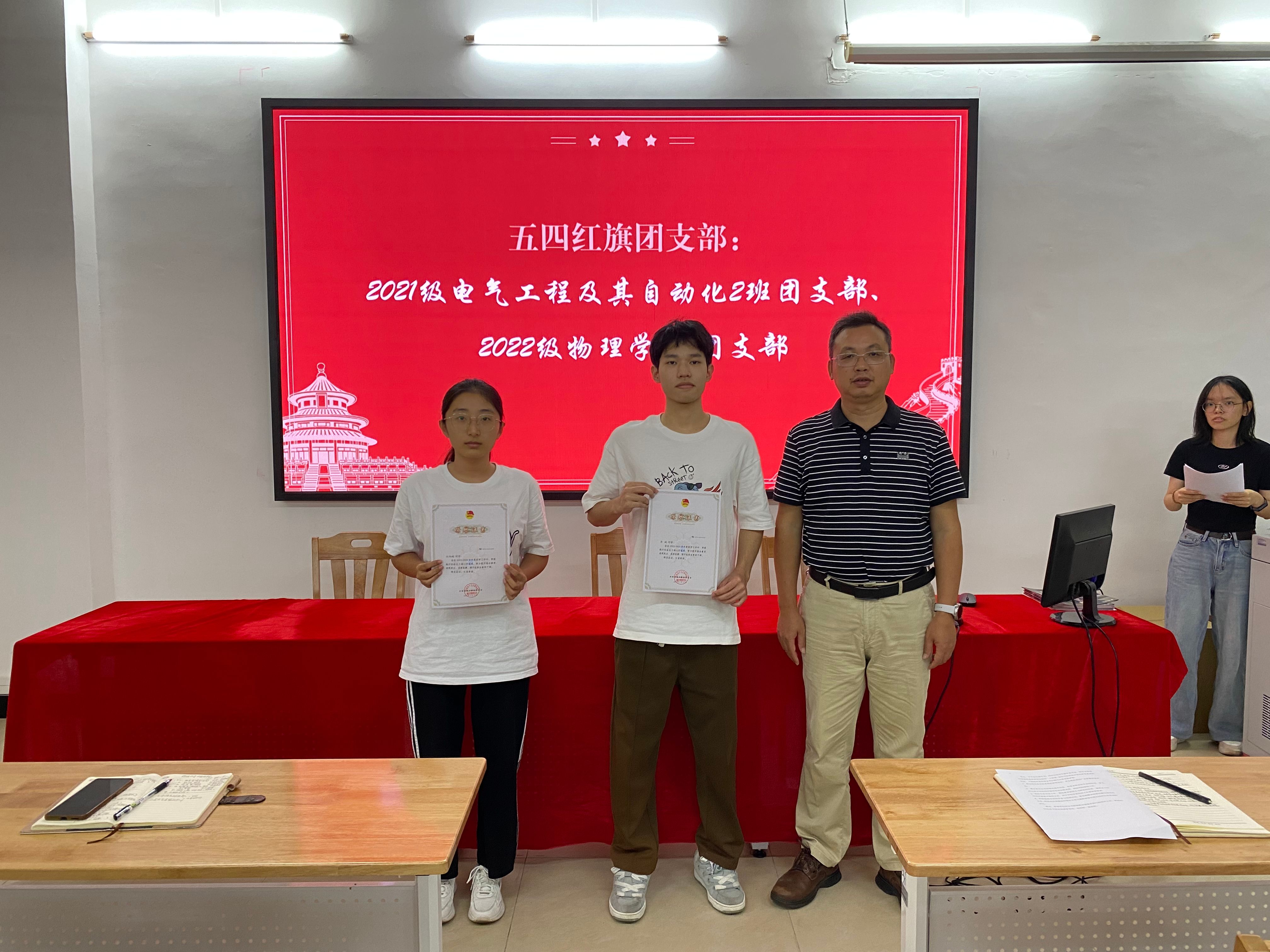 会议还对学校2023-2024学年度五四红旗团支部、优秀共青团干部、优秀共青团员进行了表彰,傅汉球、刘浏分别为获奖团支部、个人颁发证书。