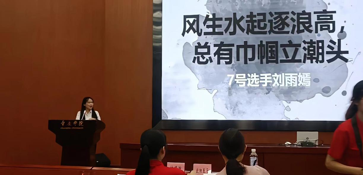 据悉,刘雨嫣同学在校期间认真学习、积极参加校内活动及社会实践活动,为评选巾帼之星打下良好的基础。在众多“巾帼之星”候选人之中,她深感自己不算出众,但她不轻言放弃,只为追求更好的自己。备赛期间,她对将要发言的稿子字字斟酌,不急于求成,循序渐进,精益求精,“千锤百炼出真金”她坚信每一分努力都会有回报。在“巾帼之星”评选活动现场,她明白唯有时刻坚信自己,才能突破自己。她在比赛过程中不甘落后,打破重重困难,最终从众多的“巾帼之星”候选人中脱颖而出,荣获肇庆学院第十七届“巾帼之星标兵”!